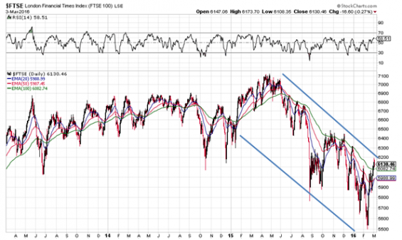 英國退歐疑慮導致英鎊大跌,但這種擔憂似乎並未延續至股市。富時100指數在下降軌道中反彈,如果升破下降軌道則後市看漲,否則,後市將在下降軌道中回落。