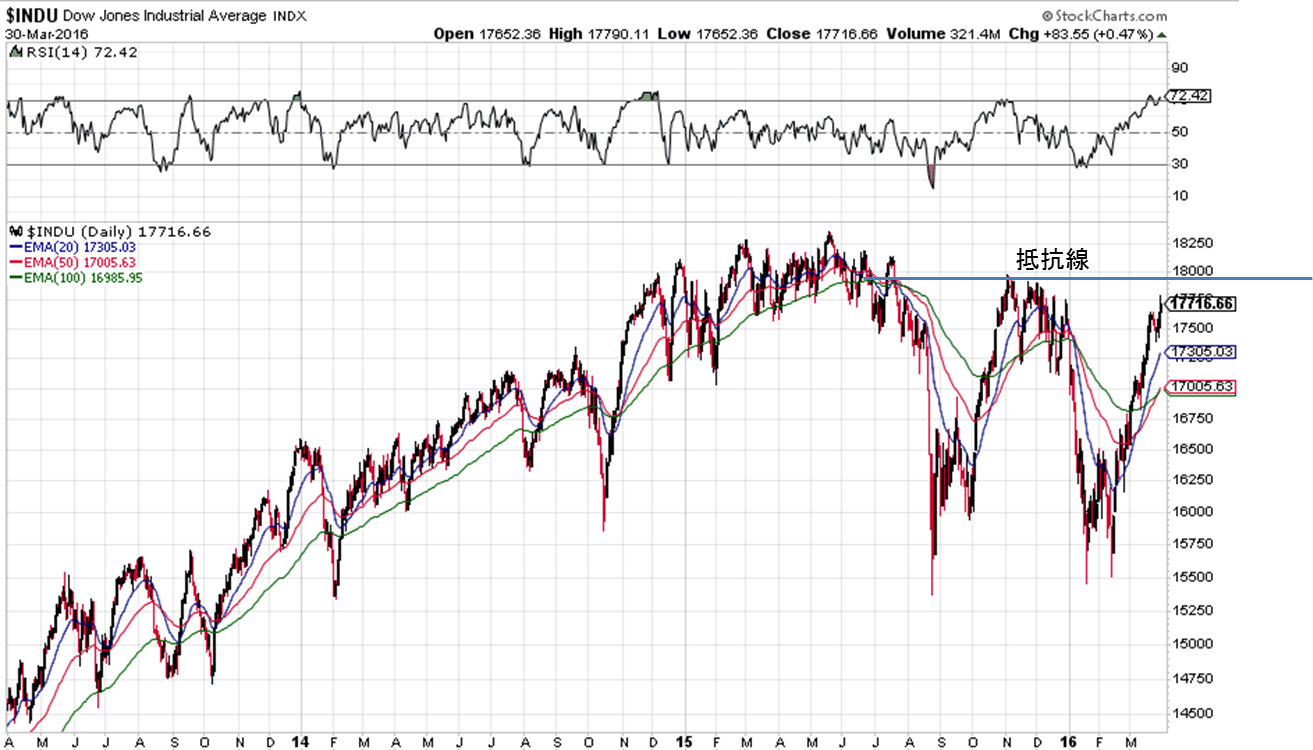 耶倫週二發表鴿派言論,稱美聯儲的加息步伐應更為緩慢,此番鴿派言論推動美股創下2016年新高。道指上方主要阻力位在18000點處,若能突破則後市有機會繼續回升。但需留意的是,RSI指數進入超買區,應警惕短期回調的可能性。