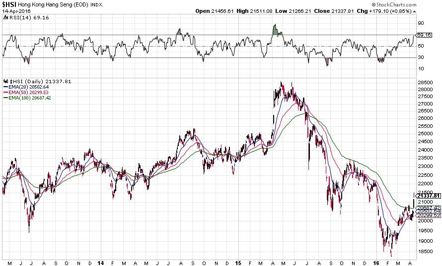 中國三月出口數據大幅好轉,IMF調高2016年中國經濟增長預期,加之美元走弱油價上漲,消息面利好港股,恆指於三個月以來首次站上21000點大關。短期來看,只要恆指不跌破長天平均線20674.28點,則上升勢頭有機會繼續維持。
