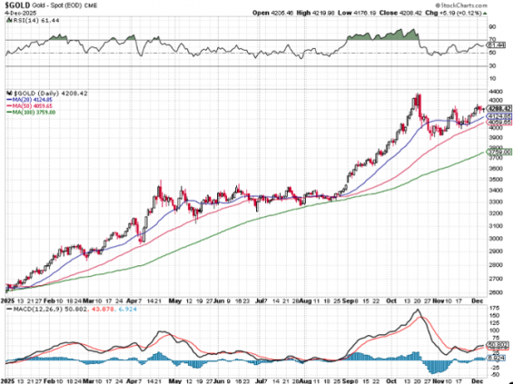 黃金在4,258美元/盎司附近形成雙頂,過去一個月金價一路震蕩上行,目前RSI指數買方動力充足,MACD買入信號,短期可能延續震蕩上行的趨勢,如果突破4,258美元,有機會衝擊之前的高位。