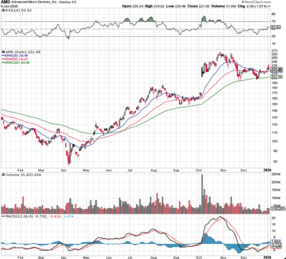 超微半導體股價從100日均綫反彈到20日/50日均綫附近,RSI指數中性偏强,MACD買入信號。考慮到馬上將發佈新一代GPU芯片,預計性能將大幅提升。投資者可關注近期發佈會内容,如性能大幅提升且AI和數據中心方案有競爭力,可能推動股價短期上漲5%-10%,目標價260美元。
