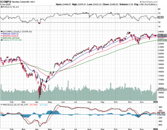 納斯達克指數目前維持震蕩整理,目前已經站穩20日均綫上方,RSI指數60.92, 1月初MACD走出死叉,成交量減少,預計將呈現震蕩尋底,逐步反彈的走勢。可以在50日均綫附近的23200附近建倉,止損設置爲整數心理支撐位23000。