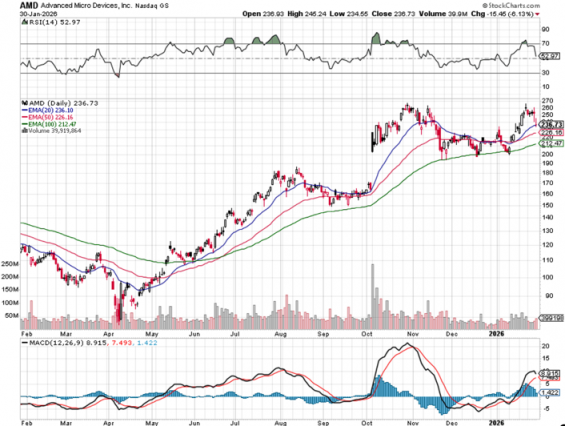 超微半導體股價從1月23日最高260美元下跌至目前236.73美元(1月30日)呈高位回調態勢,RSI中性偏多,但多頭動力不足,美國東部時間2月3日將公佈最新財報,建議在公佈前不要投資,之後根據財報情況決定投資方向,如財報不合預期,可能跌破215美元,下探200美元心理關口,如超過預期,可能超過245美元,衝擊之前高位260美元。