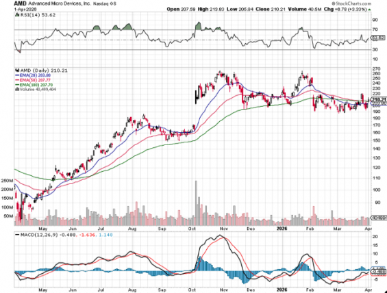 超微半導體股價20/50/100日均綫接近空頭排列,當前價格相比1月高點已經下跌超過25%,RSI中性偏買方,MACD上升態勢但強度較弱,目前已經從50周均線190附近反彈回20周均線上方,預計未來1個月仍然會在20周和50周均線之間維持震盪,可以嘗試在180-190美元附近建倉,預計第二或第三季度有機會再次衝擊之前高點。