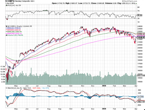 納斯達克綜合指數3月震蕩下行,3月31日在伊朗地緣政治緩和,美聯儲消息打壓加息擔憂及超賣報復性反彈等因素影響下大漲,但20/50/100日均綫空頭排列,且反彈后指數仍維持在200日均綫下方,上行阻力巨大,RSI目前中性偏賣方,MACD接近金叉,反彈動力不足,最初兩周可能震蕩上行,但上方均綫密集強阻力,無法突破回落后可能進一步探底。