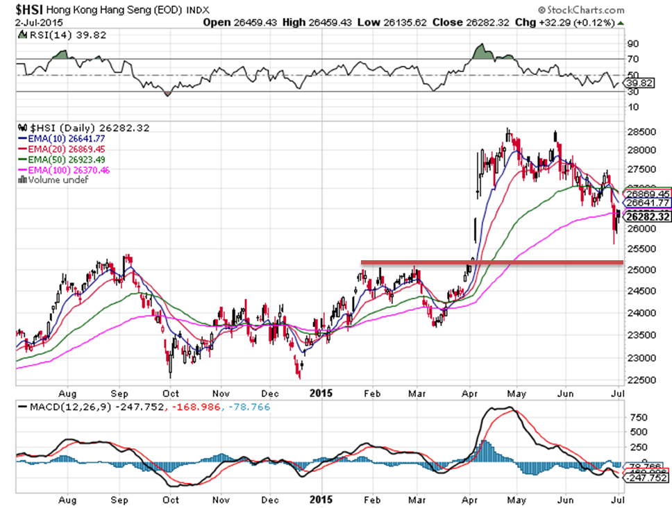 (市場更新)恆生指數受外圍大盤拖累,六月份起股價持續向下,一度跌穿26000點關口,現股價已回吐三四月份的近一半的升幅,短線25000點為重要支持位。