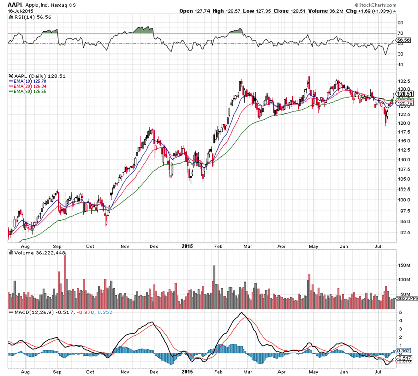 (市場更新)蘋果公司股價雖七月起連跌數日,一度跌穿120美元,但及後回穩,MACD負差距收窄及RSI指標向上,後市預料股價持續走穩。