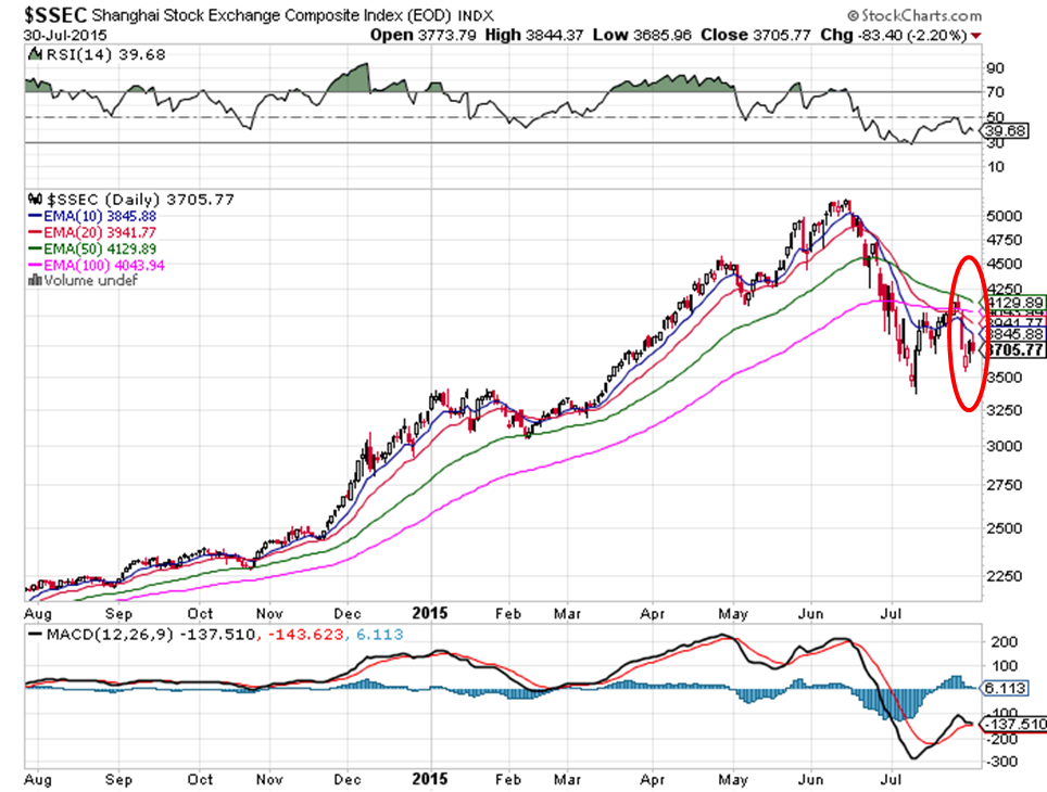 (市場更新) 中國上證指數同樣七月倒跌,中央暴力救市雖令指數一度穿升4100點,但及後升勢不保,回挫至3700點,後市好淡爭鬥或成常態,令指數更反覆。