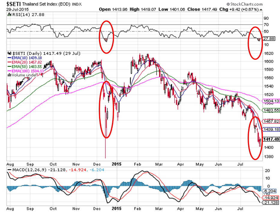 (市場跟進)泰國股市(SET指數)大跌,指數一直下探上年指數的最低點,唯可留意RSI指數超賣,後市或有短暫的技術型反彈。
