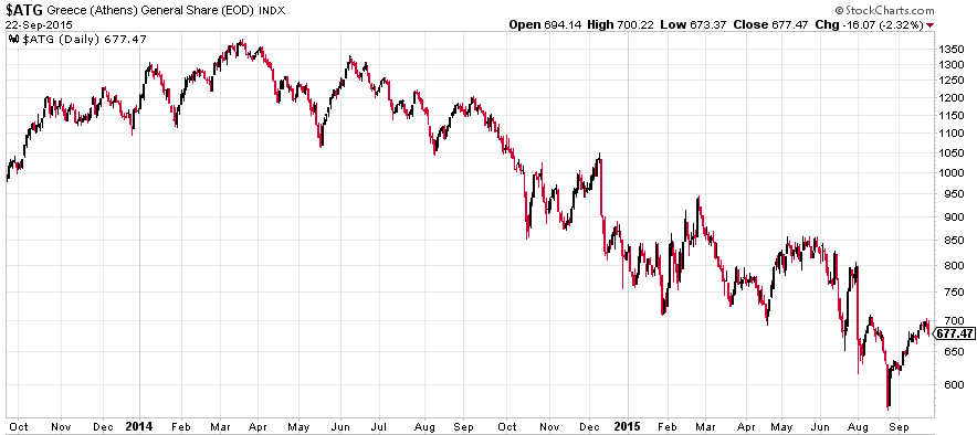 希臘大選有結果,齊普拉斯再度勝出,雖然政局轉趨明朗,但希臘的長遠前景仍受困於難以解決的債務問題。圖表顯示,希臘股市至今仍處於下降通道內,反映市場對希股後市缺乏信心。