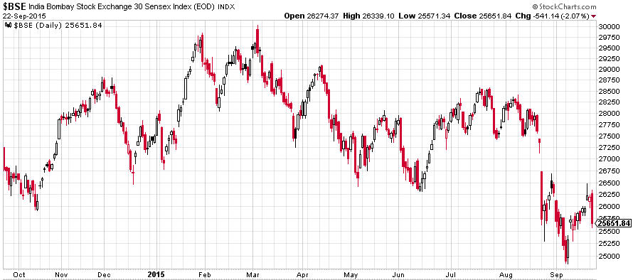 印度股市由9月份的低位顯著反彈,但指數升至26,500點時見阻力。在早前的跌浪中,印股留下了兩個下跌裂口,除非印股日後於回補裂口後能繼續上升;否則,印股仍屬弱勢。