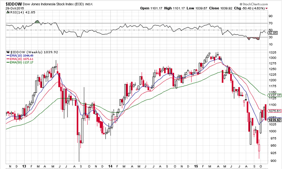 印尼股市升勢受挫,十月初指數超賣反彈,一週內一度大升超過15%,但股市未能守穩升幅,本週週四為止跌4.63%,短線股市或進一步回吐。