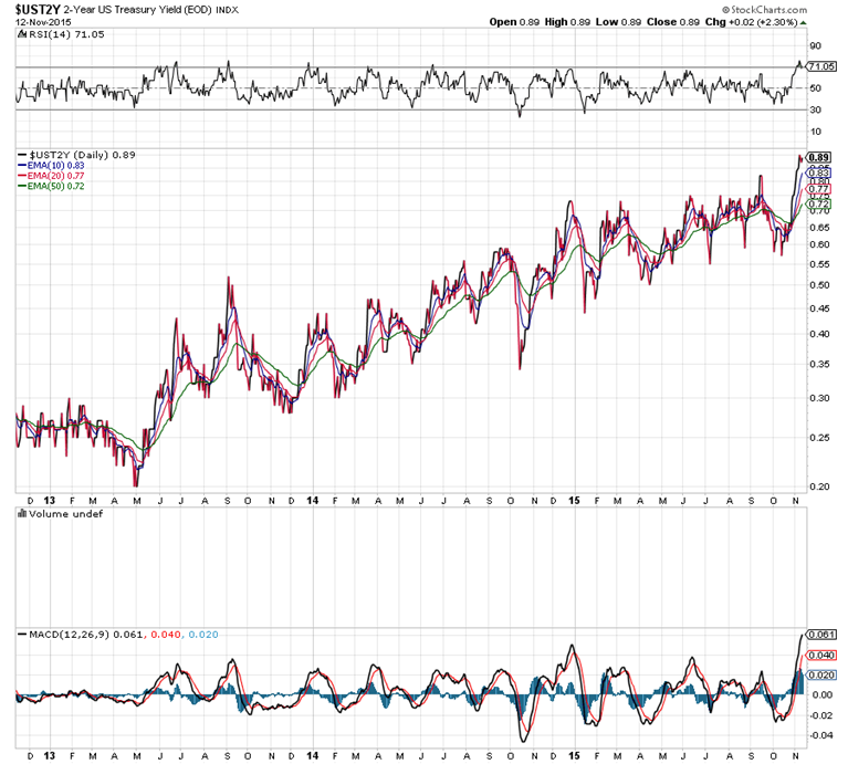 美聯儲局暗示或於十二月份加息,消息公佈後美國債券孳息率急升,其中二年期債券孳息率升四年半高位,反映市場認為今年加息機會高。