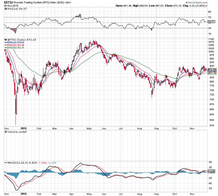 俄羅斯股市亦受影響,但指數暫站穩短天數移動平均線上,反映股市對利空消息已有一定抗力,短期預料股市或會持續於725-925區間震盪。