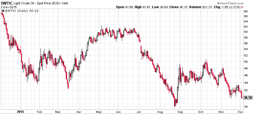美元強勢,加上全球經濟放緩打擊了需求,油價弱勢持續。40元為油價的重要支持位,若失守,後市恐怕要下試9月的低位。在油價低迷下,環球通脹可望維持在低水平,低通脹環境有利主要央行繼續實施寬鬆貨幣政策。